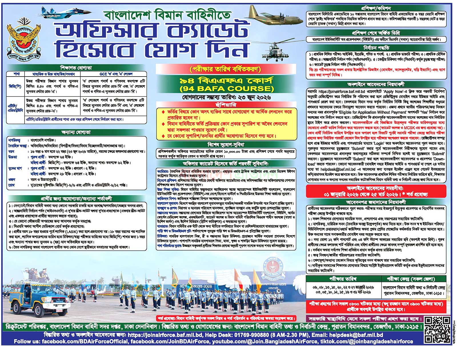 বাংলাদেশ বিমান বাহিনী অফিসার ক্যাডেট নিয়োগ বিজ্ঞপ্তি ২০২৬–এর খবরটি প্রকাশিত হয়েছে বিমান বাহিনীর নিজস্ব অফিসিয়াল ওয়েবসাইটে, প্রকাশের তারিখ ০১ জানুয়ারি ২০২৬ ইং। আবেদন গ্রহণ করা হবে শুধুমাত্র অনলাইনে, নির্ধারিত পোর্টাল https://joinairforce.baf.mil.bd এর মাধ্যমে। এই নিয়োগ বিজ্ঞপ্তির মাধ্যমে ৯৪ বিএএফএ কোর্সে বিভিন্ন শাখায় (যেমন: জিডি(পি), ইঞ্জিনিয়ারিং, লজিস্টিক, অ্যাডমিন, এটিসি ইত্যাদি) শূন্যপদে যোগ্য প্রার্থী নেওয়া হবে। সাধারণ প্রার্থীদের জন্য বয়সসীমা নির্ধারণ করা হয়েছে ১৬ বছর ৬ মাস থেকে ২২ বছর, যেখানে বয়স গণনার তারিখ ধরা হয়েছে ২৩ জুন ২০২৬। প্রতিটি আবেদনের জন্য ফি নির্ধারণ করা হয়েছে ২০০/- টাকা, যা অনলাইন পেমেন্ট গেটওয়ের মাধ্যমে পরিশোধ করতে হবে।