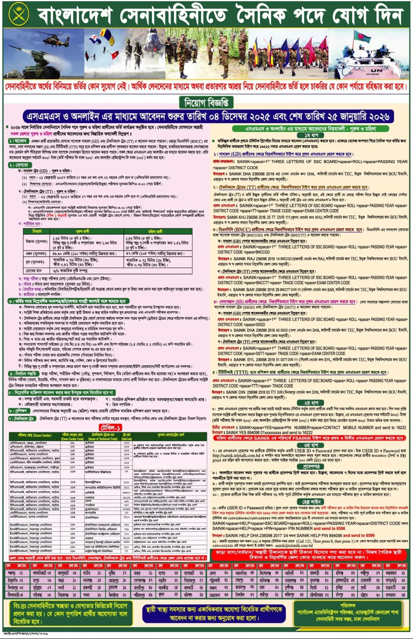 বাংলাদেশ সেনাবাহিনী সৈনিক নিয়োগ ২০২৬ সার্কুলার অনুযায়ী অসংখ্য জন যোগ্যতা ও অভিজ্ঞতা স্বয়ং সম্পন্ন নারী ও পুরুষকে স্থায়ীভাবে সেনাবাহিনীর সৈনিক ক্যাটাগরি পদে এ নিয়োগ দিবে। অনলাইনে https://sainik.teletalk.com.bd ওয়েবসাইটে ঢুকে শিক্ষাগত সার্টিফিকেটের তথ্য, জাতীয় পরিচয়পত্রের তথ্য, রঙিন ছবি, (Passport Size Photo) স্বাক্ষরের ছবি দিয়ে আবেদন ফরম (Application Form) পূরণ করা লাগবে। Sainik Job Circular 2026 এর অনলাইনে আবেদন চলবে ০৪ ডিসেম্বর ২০২৫ ইং থেকে ও শেষ হবে ২৫ জানুয়ারি ২০২৬ ইং। নিচে সেনাবাহিনী সৈনিক নিয়োগ বিজ্ঞপ্তি ২০২৬ (Army Sainik Job Circular 2026) সর্ম্পকে বিস্তারিত আলোচনা করা হয়েছে।