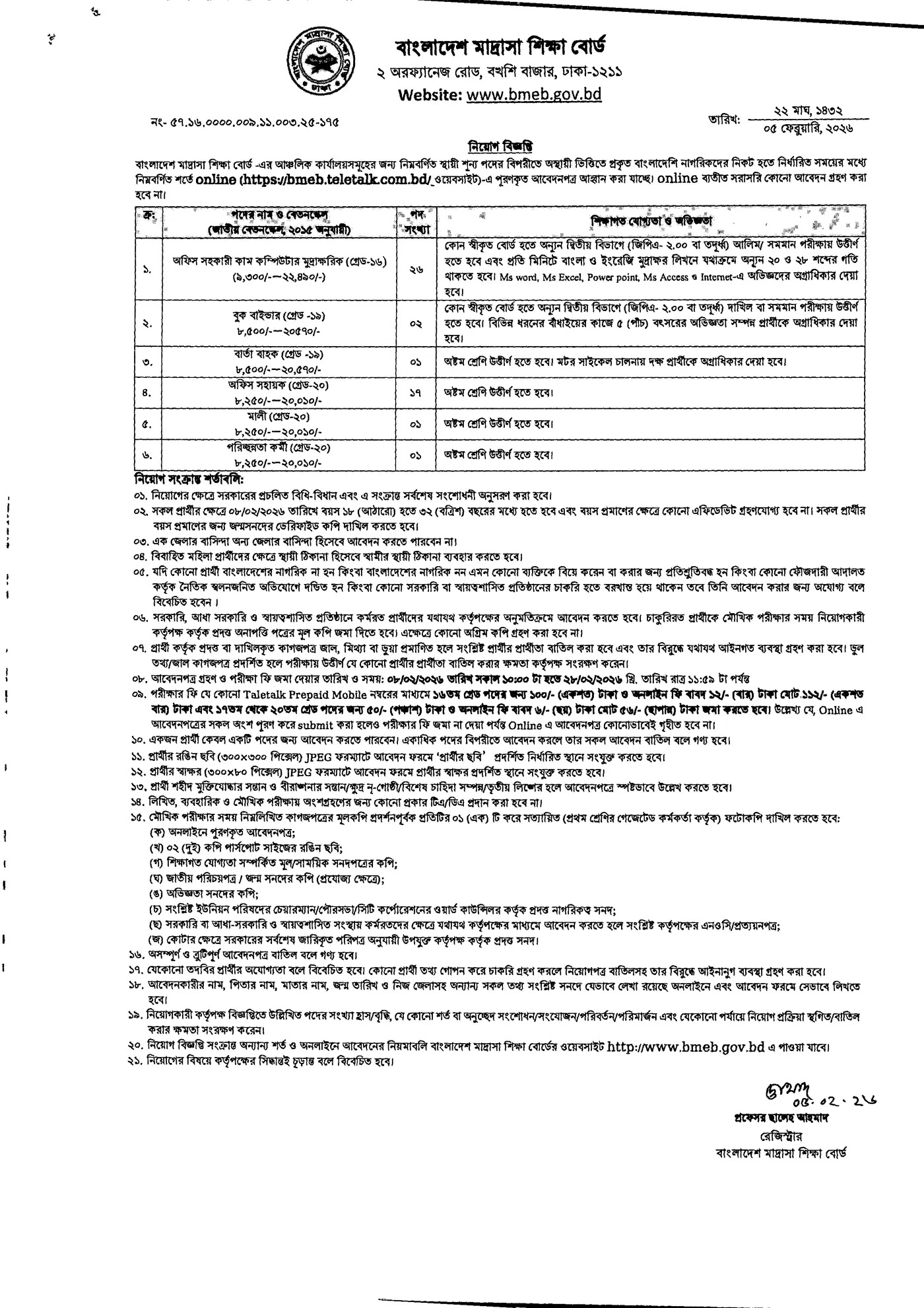 বাংলাদেশ মাদ্রাসা শিক্ষা বোর্ড নিয়োগ বিজ্ঞপ্তি ২০২৬–এর খবরটি প্রকাশিত হয়েছে অফিসিয়াল ওয়েবসাইট ও অলজবস টেলিটকে, প্রকাশের তারিখ ০৫ ফেব্রুয়ারি ২০২৬ ইং। আবেদন গ্রহণ করা হবে শুধুমাত্র অনলাইনে, নির্ধারিত পোর্টাল https://bmeb.teletalk.com.bd এর মাধ্যমে। এই নিয়োগ বিজ্ঞপ্তির মোট ০৬টি ক্যাটাগরিতে ৪৮ জন শূন্যপদে প্রার্থী নেওয়া হবে। সাধারণ প্রার্থীদের জন্য বয়সসীমা নির্ধারণ করা হয়েছে ১৮ থেকে ৩২ বছর, যেখানে বয়স গণনার তারিখ ধরা হয়েছে ০৮ ফেব্রুয়ারি ২০২৬। প্রতিটি আবেদনের জন্য ফি নির্ধারণ করা হয়েছে ৫৬ ও ১১২ টাকা (পদ অনুযায়ী), যা Teletalk SMS এর মাধ্যমে পরিশোধ করতে হবে।