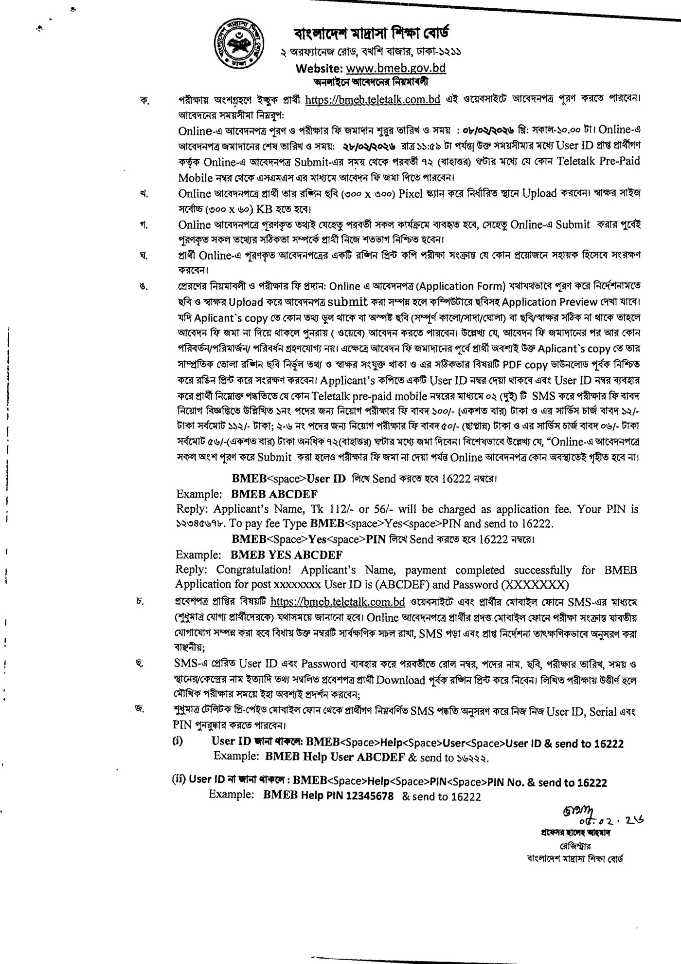 বাংলাদেশ মাদ্রাসা শিক্ষা বোর্ড নিয়োগ বিজ্ঞপ্তি ২০২৬–এর জন্য আবেদন ফি জমা দিতে হবে Teletalk Prepaid SIM এর মাধ্যমে ২টি SMS করে।
