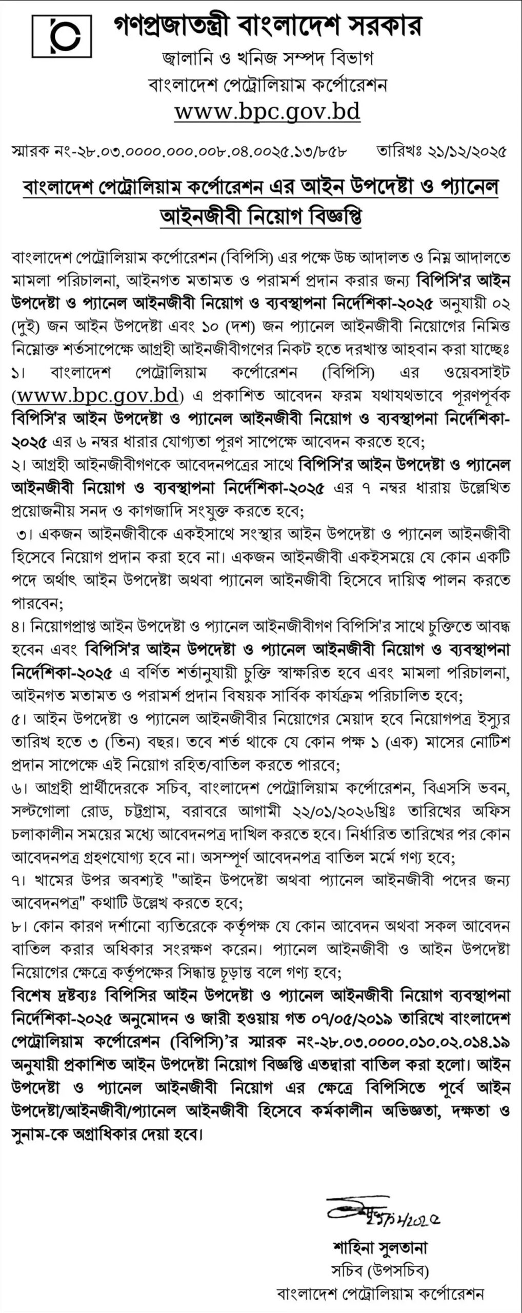 নিয়োগকারী সংস্থাবাংলাদেশ পেট্রোলিয়াম কর্পোরেশন (BPC)