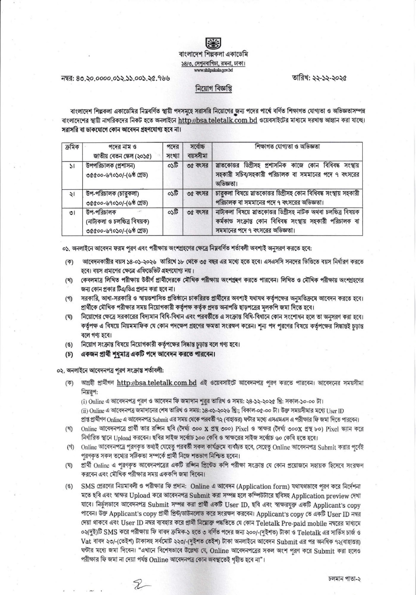 নিয়োগকারী সংস্থাবাংলাদেশ শিল্পকলা একাডেমি (BSA)