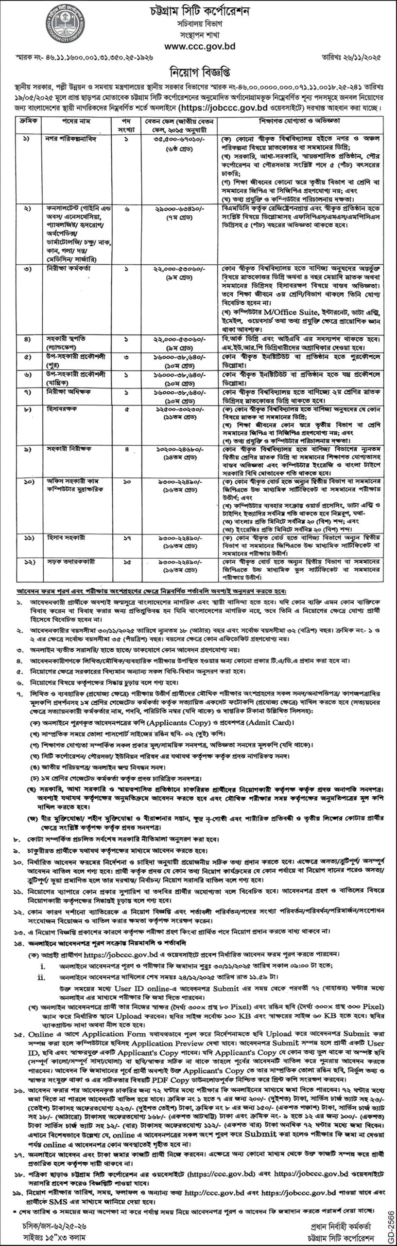 চট্টগ্রাম সিটি কর্পোরেশন (CCC) কর্তৃপক্ষ হতে চট্টগ্রাম সিটি কর্পোরেশন নিয়োগ বিজ্ঞপ্তি ২০২৫ (Chittagong City Corporation Job Circular 2025) অফিসিয়াল ওয়েবসাইটে এবং দি ডেইলি স্টার পত্রিকায় ২৭ নভেম্বর ২০২৫ ইং তারিখে প্রকাশ হয়েছে। এই নিয়োগ বিজ্ঞপ্তির মাধ্যমে মোট ১২ ক্যাটাগরি পদে ৬৫ জন যোগ্য নারী-পুরুষকে স্থায়ীভাবে নিয়োগ দেওয়া হবে।