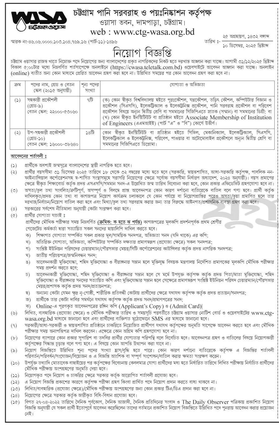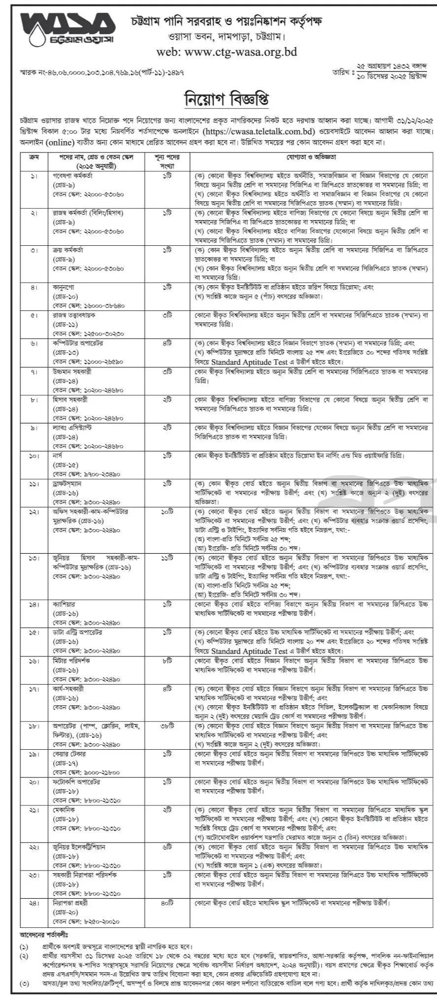 চট্টগ্রাম পানি সরবরাহ ও পয়:নিষ্কাশন কর্তৃপক্ষ (CWASA) হতে চট্টগ্রাম ওয়াসা নিয়োগ বিজ্ঞপ্তি ২০২৫ (Chittagong WASA Job Circular 2025) অফিসিয়াল ওয়েবসাইটে এবং দৈনিক যুগান্তর পত্রিকায় ১১ ডিসেম্বর ২০২৫ ইং তারিখে প্রকাশ হয়েছে। এই নিয়োগ বিজ্ঞপ্তির মাধ্যমে মোট ২৬ ক্যাটাগরি পদে ১৬৫ জন যোগ্য নারী-পুরুষকে স্থায়ীভাবে নিয়োগ দেওয়া হবে।