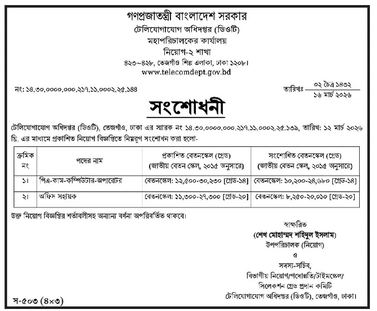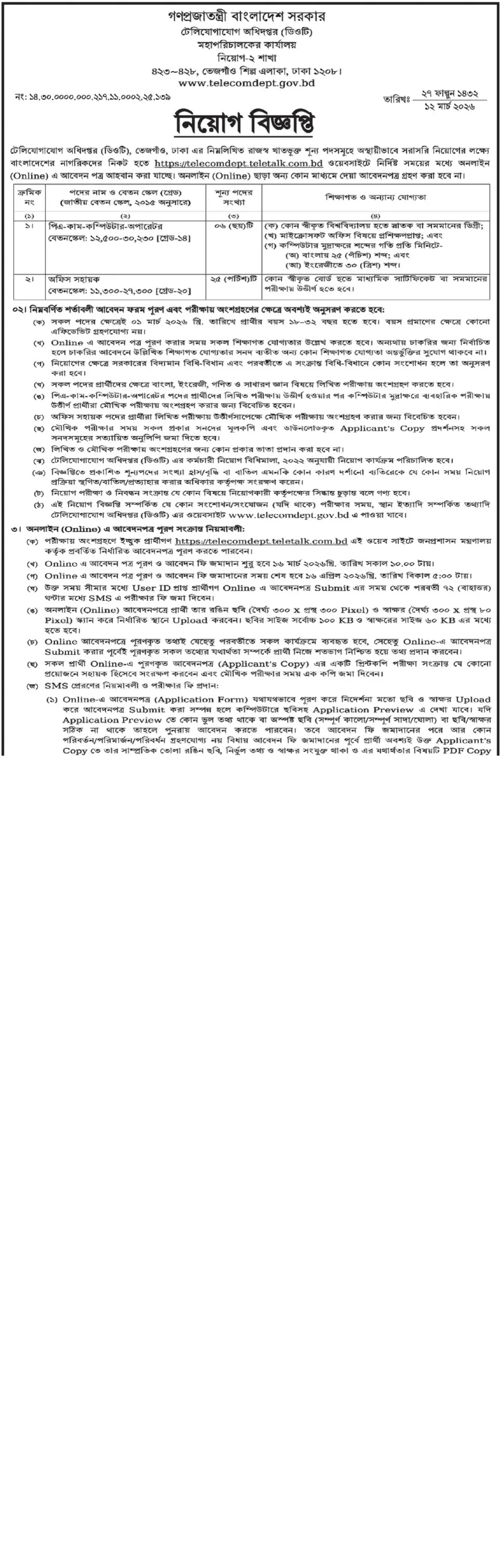 টেলিযোগাযোগ অধিদপ্তর নিয়োগ বিজ্ঞপ্তি ২০২৬ এর পিডিএফ / ইমেজ