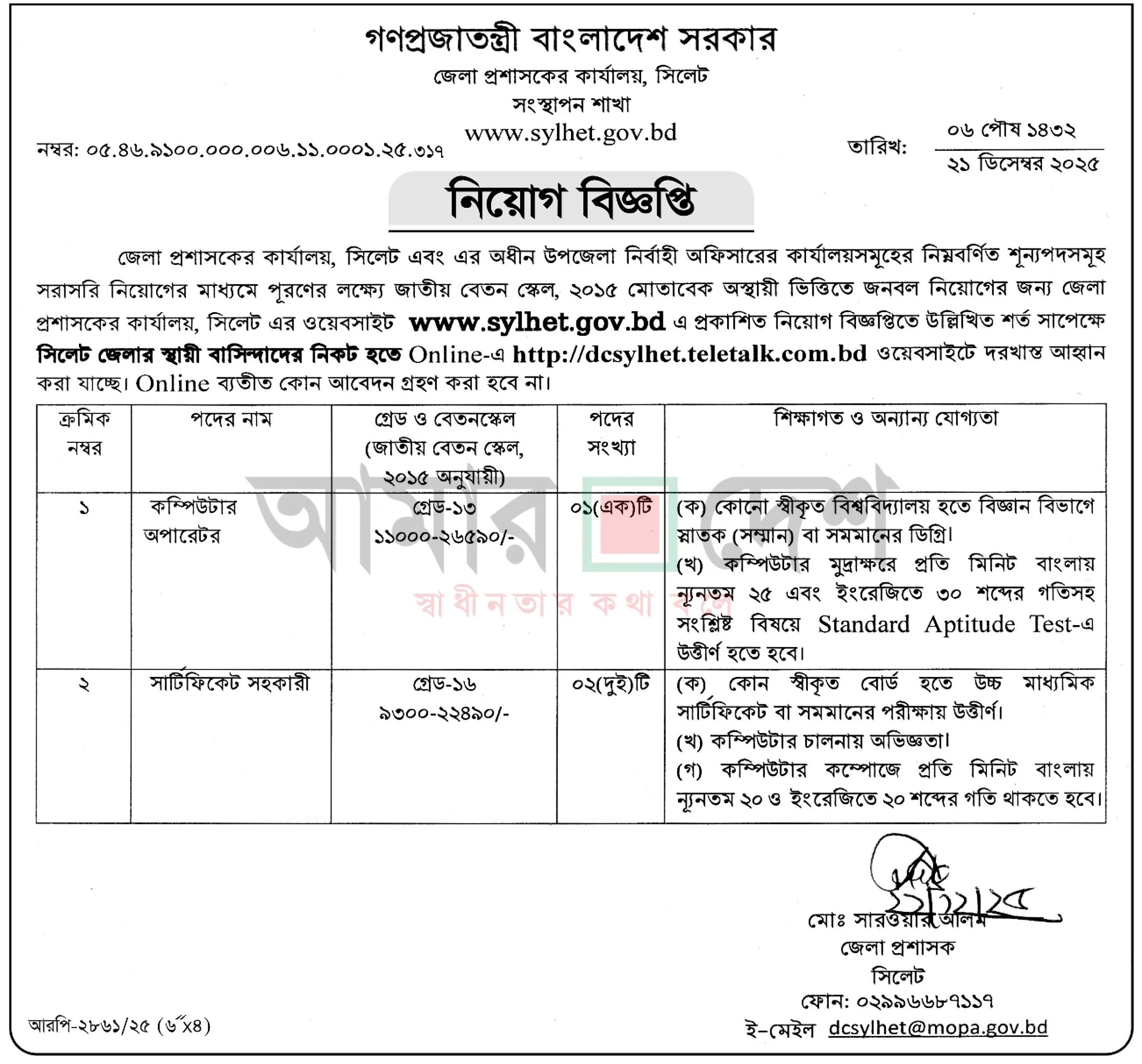 | নিয়োগকারী সংস্থা | সিলেট জেলা প্রশাসকের কার্যালয় |